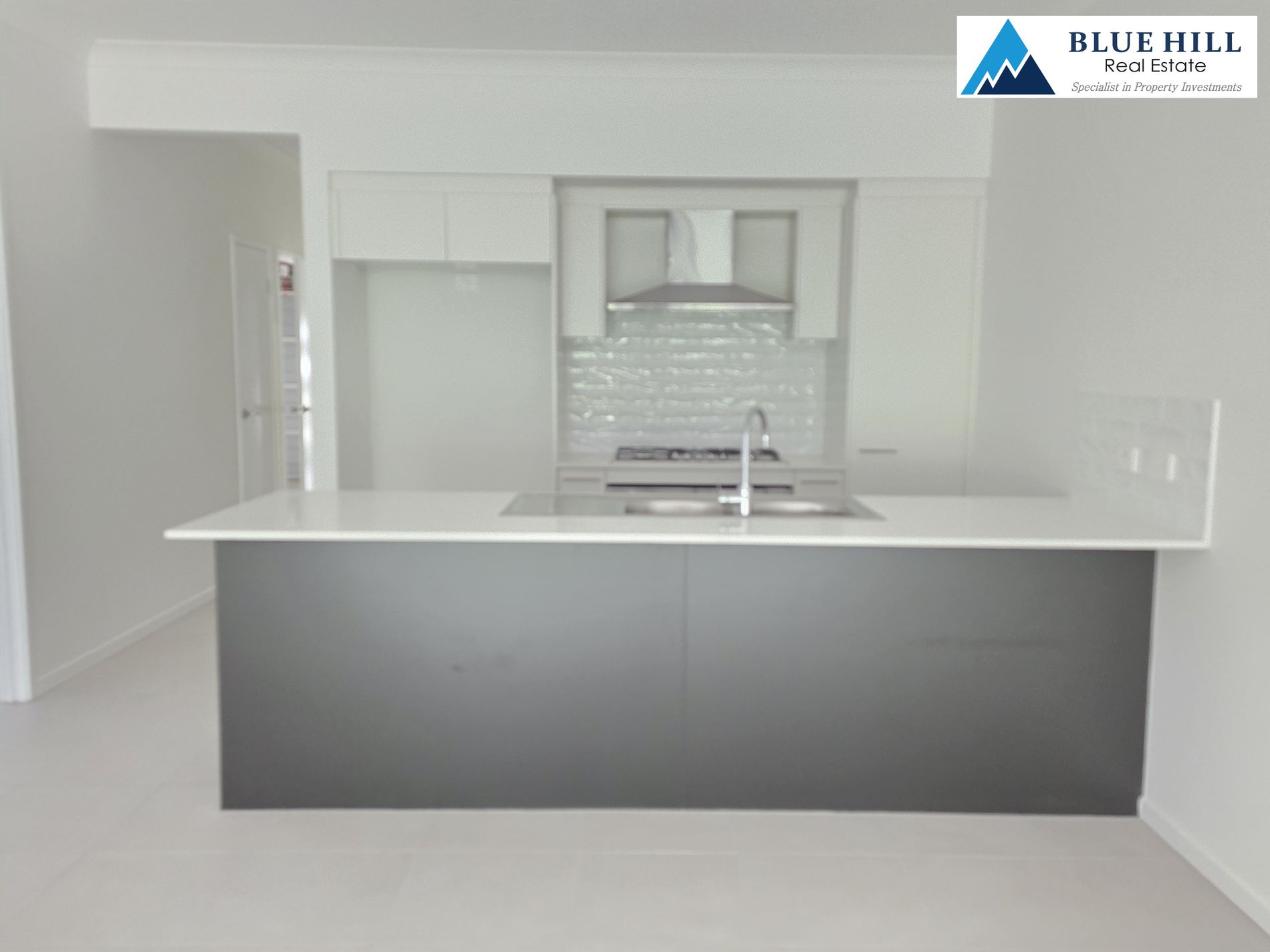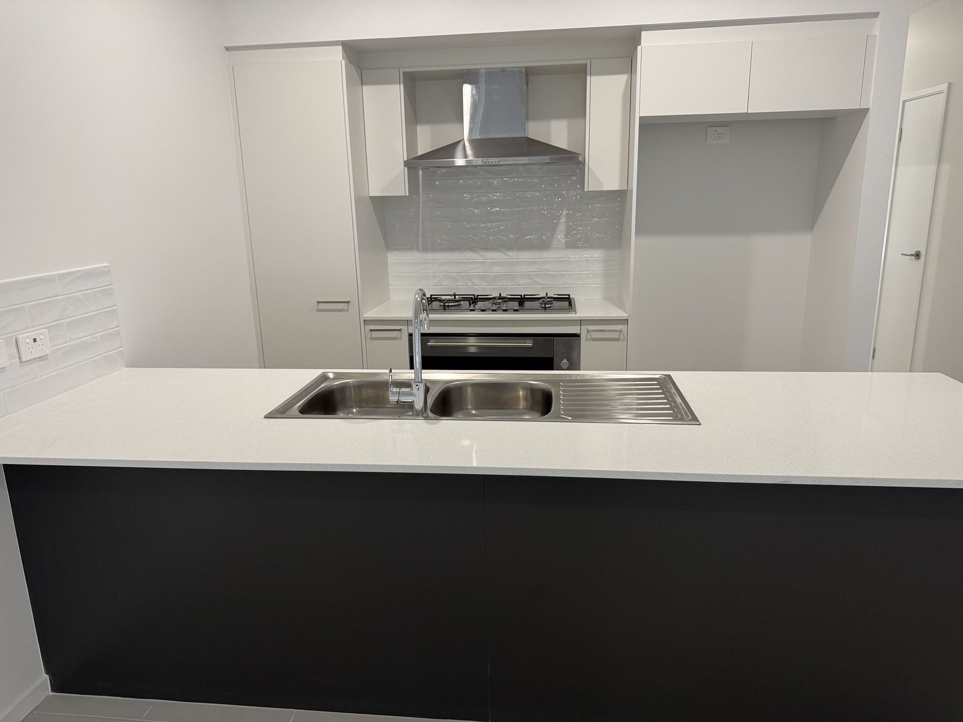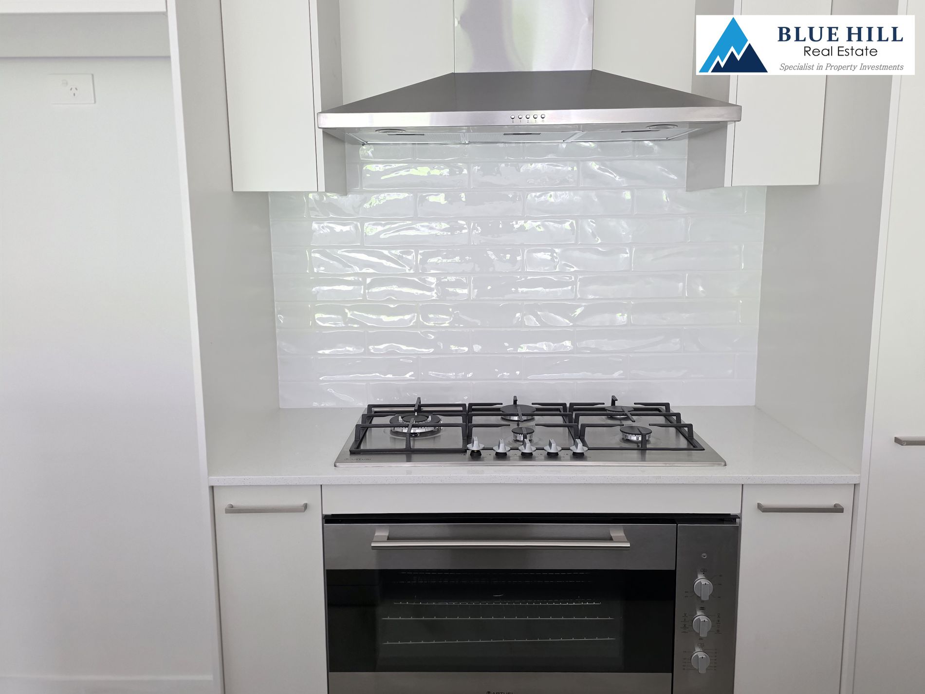 * Elegant kitchen with stone benchtops, stainless steel appliances including dishwasher, oven, gas cooktop and rangehood.